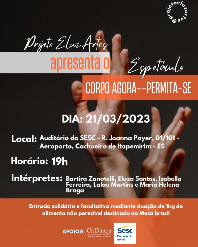 AGENDE-SE! Espetáculo de dança contemporânea “Corpo agora: permita-se!” Dia 21/03/2023, às 19h. No auditório do Sesc de Cachoeiro de Itapemirim, no bairro Aeroporto. Entrada gratuita e livre. Pede-se a doação de um quilo de alimento não perecível. Realização: Projeto EluzArtes. Classificação etária: 14 anos.